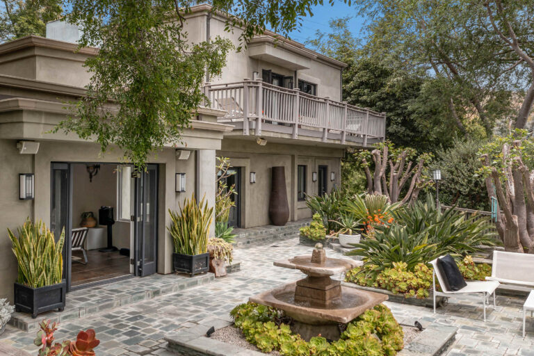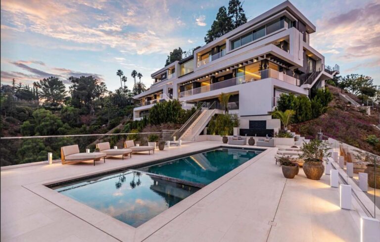 Skyline and sea stretch out before this teak-paneled, canyon-top L.A. home. A hot tub bubbles in an entertaining area with a pool and outdoor kitchen, while 2 more terrace levels run the width of the house above—and boast a swingset and mini basketball court. White stone, wood, and brass lend subtle mid-century appeal to the great room. It’s 5 minutes down to West Hollywood landmarks and dining.