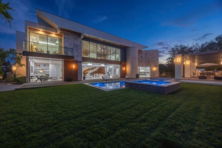 The interiors are defined by clean architectural lines and warm natural finishes, creating an atmosphere that feels both elevated and inviting. High ceilings and expansive pocket doors connect the living, dining, kitchen, and media spaces to the surrounding grounds, allowing light and air to move freely throughout. The chef’s kitchen serves as the centerpiece, complemented by multiple gathering areas designed for both quiet moments and hosting. Four en suite bedrooms each open to their own outdoor space, while a separate guest house adds flexibility with its own kitchen and fire-lit patio.